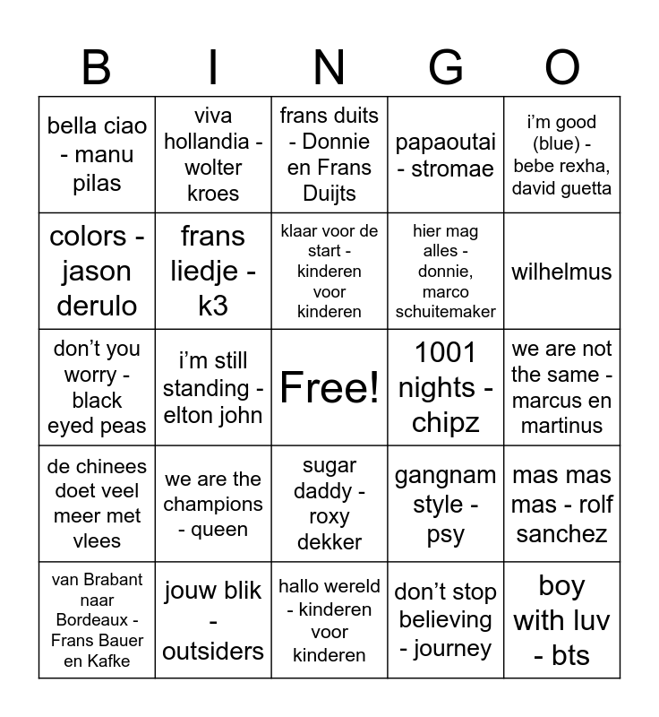 This bingo card has a free space and 51 words: waka waka - shakira, boy with luv - bts, sofia - alvaro soler, hallo wereld - kinderen voor kinderen, we are the champions - queen, eye of the tiger - survivor, viva hollandia - wolter kroes, we are one (olé ola) - pitbull, colors - jason derulo, wij houden van oranje - andré hazes, frans liedje - k3, papaoutai - stromae, mas mas mas - rolf sanchez, gangnam style - psy, europapa - joost klein, parijs - kenny b, klaar voor de start - kinderen voor kinderen, 1001 nights - chipz, oranjebewaarder - marco schuitemaker, i’m good (blue) - bebe rexha, david guetta, i’m still standing - elton john, don’t stop believing - journey, bella ciao - manu pilas, hier mag alles - donnie, marco schuitemaker, bewegen is gezond - kinderen voor kinderen, wij zijn nederland - jan smit, wilhelmus, dragostea din tei - o-zone, van Brabant naar Bordeaux - Frans Bauer en Kafke, frans duits - Donnie en Frans Duijts, goud - suzan en freek, hoogste versnelling - nielson, counting stars - onerepublic, my head, my heart - ava max, links rechts - snollebollekes, jouw blik - outsiders, huisje op wielen - outsiders, engelbewaarder - outsiders, cruel summer - taylor swift, can i see you tonight - natalie jane, we are not the same - marcus en martinus, de chinees doet veel meer met vlees, plystre pa deg - marcus en martinus, anne fleur vakantie - roxy dekker, nofear - dej loaf, engelengezang - donnie en snollebollekes, don’t you worry - black eyed peas, dance monkey - tones and I, dans met jou - mathieu, sugar daddy - roxy dekker and love story - taylor swift.