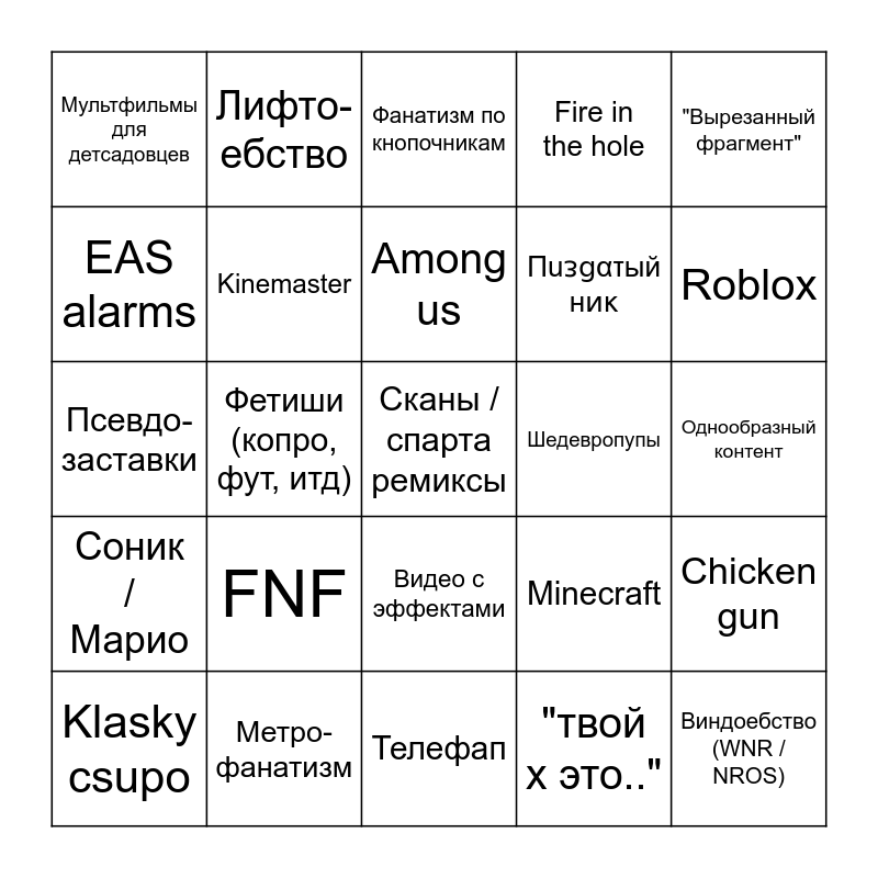 This bingo card has 29 words: Klasky csupo, Пониебство, Фетиши (копро, фут, итд), Виндоебство (WNR / NROS), Мультфильмы для детсадовцев, Фанатизм по кнопочникам, Kinemaster, FNF, Шедевропупы, Метро-фанатизм, Однообразный контент, Сканы / спарта ремиксы, Телефап, "твой x это..", Roblox, Alphabet lore, Видео с эффектами, Соник / Марио, "Вырезанный фрагмент", Псевдо-заставки, Minecraft, MLAATR, Пuᴈցατый нͷκ, EAS alarms, Fire in the hole, Лифто-ебство, Chicken gun, Among us and Object shows.