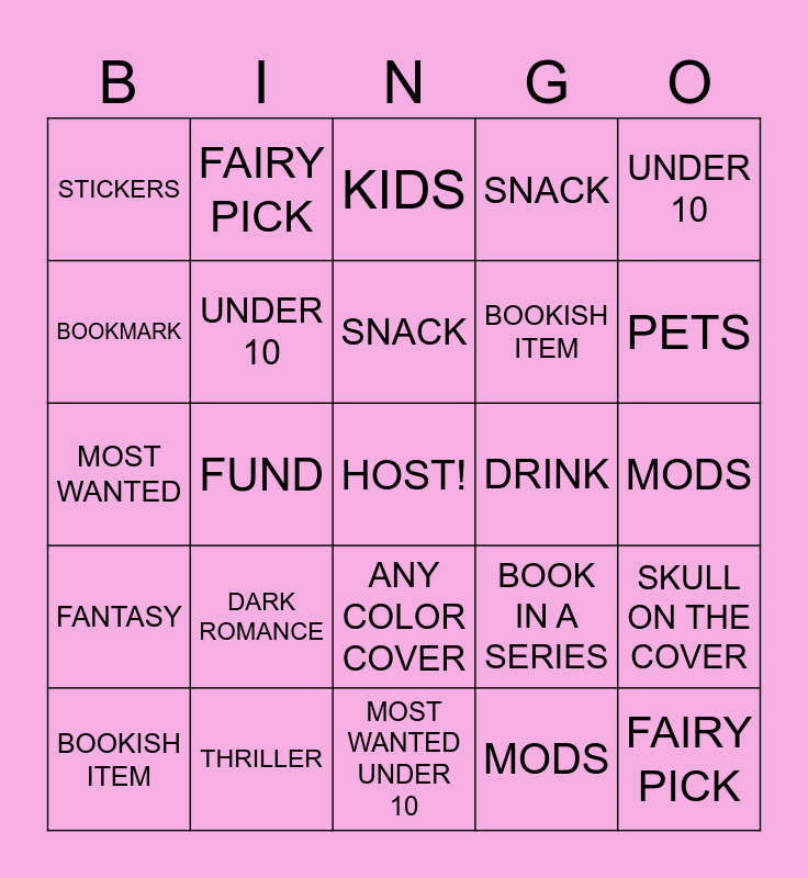 This bingo card has a free space and 24 words: DARK ROMANCE, THRILLER, SNACK, BOOKISH ITEM, UNDER 10, STICKERS, BOOKMARK, FAIRY PICK, DRINK, ANY COLOR COVER, BOOKISH ITEM, MOST WANTED, BOOK IN A SERIES, SKULL ON THE COVER, UNDER 10, MODS, MODS, KIDS, PETS, FUND, FAIRY PICK, FANTASY, SNACK and MOST WANTED UNDER 10.