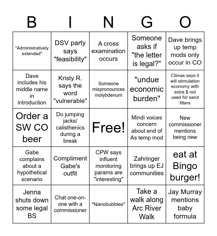This bingo card has a free space and 24 words: Compliment Gabe's outfit, Chat one-on-one with a commissioner, Someone mispronounces molybdenum, Jenna shuts down some legal BS, Dave brings up temp mods only occur in CO, "Administratively extended", Dave includes his middle name in introduction, DSV party says "feasibility", Mindi voices concern about end of As temp mod, CPW says influent monitoring params are "interesting", "undue economic burden", Order a SW CO beer, Zahringer brings up EJ communities, eat at Bingo burger!, Kristy R. says the word "vulnerable", Take a walk along Arc River Walk, New commissioner mentions being new, A cross examination occurs, Climax says it will stimulation economy with extra $ not used for sand filters, Do jumping jacks/ calisthenics during a break, Jay Murray mentions baby formula, Gabe complains about a hypothetical scenario, Someone asks if "the letter is legal?" and "Nanobubbles".