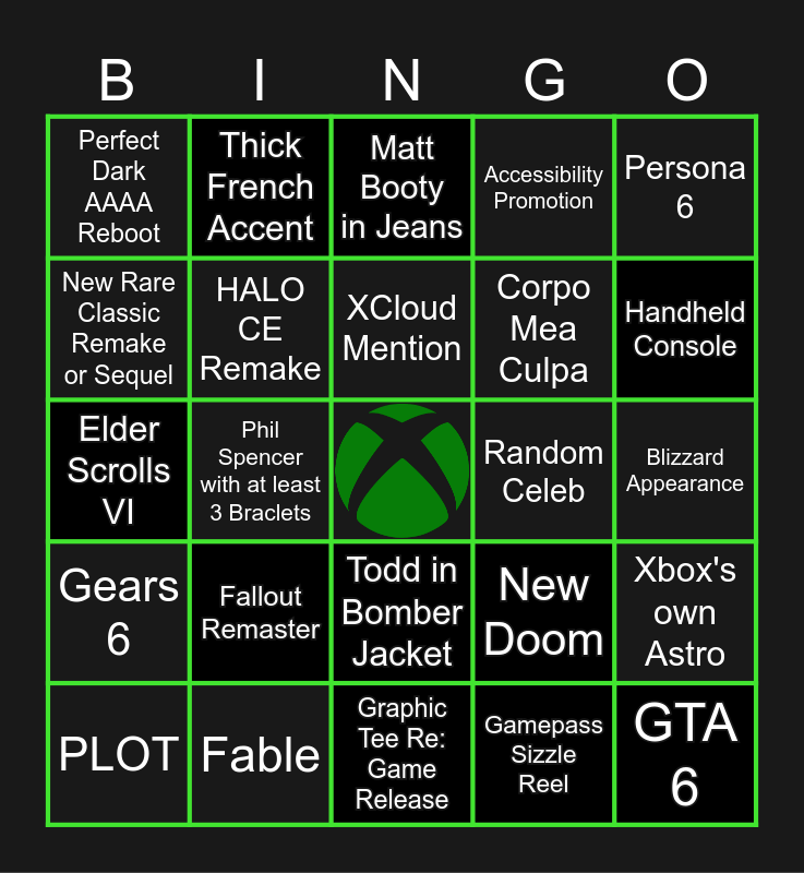 This bingo card has a free space and 30 words: Fable, One more thing, Phil Spencer with at least 3 Braclets, Mentions A.I. on Stage, Perfect Dark AAAA Reboot, Matt Booty in Jeans, HALO CE Remake, Todd in Bomber Jacket, Random Celeb, Graphic Tee Re: Game Release, Blizzard Appearance, GTA 6, Gamepass Sizzle Reel, Silk Song, Handheld Console, Sarah Bond Hard, New Doom, Gears 6, Fallout Remaster, Persona 6, Elder Scrolls VI, New Netflix Series, Thick French Accent, Corpo Mea Culpa, New Rare Classic Remake or Sequel, Accessibility Promotion, Xbox's own Astro, PLOT, XCloud Mention and Dragon Age 4.