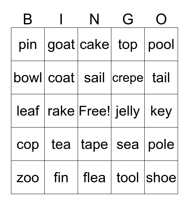 This bingo card has a free space and 24 words: tea, fin, sail, zoo, pool, pin, bowl, goat, jelly, tape, crepe, leaf, sea, pole, coat, tool, key, cake, tail, rake, shoe, cop, top and flea.