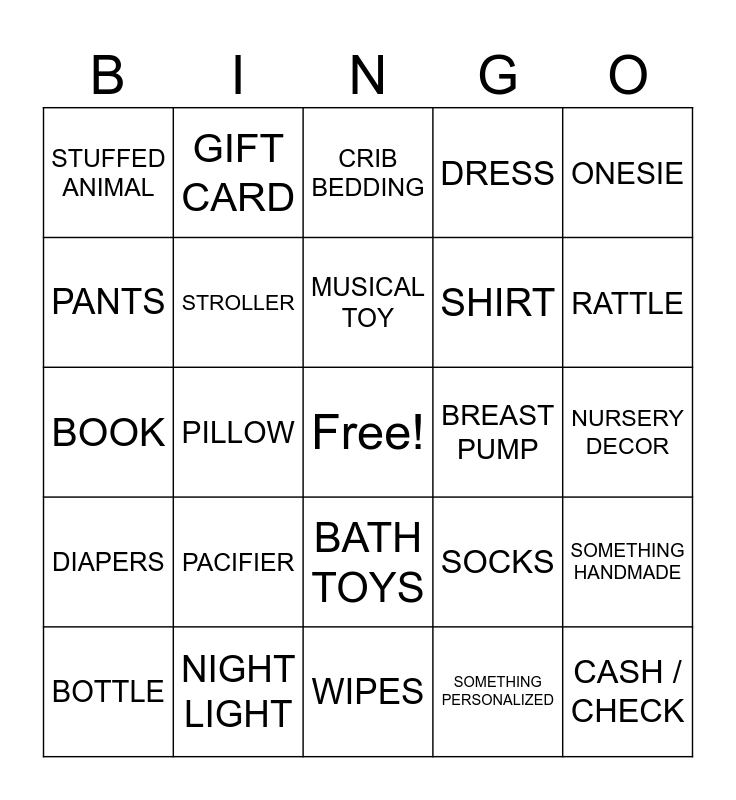 This bingo card has a free space and 33 words: MOBILE, CAR SEAT, PILLOW, BIB, DIAPERS, STROLLER, ONESIE, BOTTLE, GIFT CARD, SHOES, MUSICAL TOY, CRIB BEDDING, BLANKET, DIAPER BAG, BREAST PUMP, RATTLE, NIGHT LIGHT, BOOK, PACIFIER, SOCKS, BATH TOYS, PAJAMAS, STUFFED ANIMAL, NURSERY DECOR, WIPES, CASH / CHECK, DRESS, SHIRT, PANTS, SOMETHING HANDMADE, SOMETHING PINK, SOMETHING PERSONALIZED and SOMETHING MULTICOLORED.