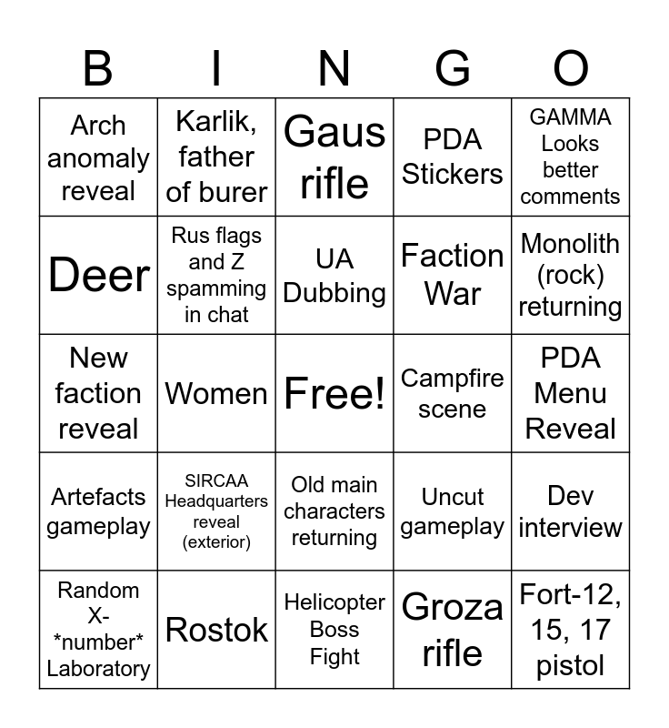 This bingo card has a free space and 24 words: SIRCAA Headquarters reveal (exterior), Rostok, UA Dubbing, Random X-*number* Laboratory, GAMMA Looks better comments, Arch anomaly reveal, Deer, Karlik, father of burer, Campfire scene, Old main characters returning, Faction War, New faction reveal, Uncut gameplay, Dev interview, Rus flags and Z spamming in chat, Groza rifle, PDA Menu Reveal, Gaus rifle, Monolith (rock) returning, Women, Fort-12, 15, 17 pistol, Artefacts gameplay, PDA Stickers and Helicopter Boss Fight.