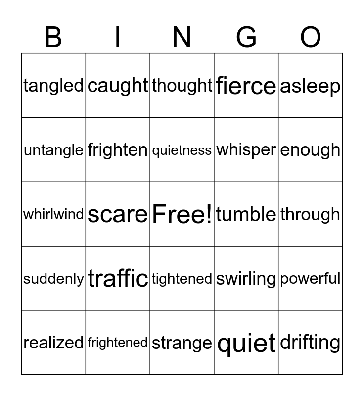 This bingo card has a free space and 24 words: traffic, frightened, quietness, realized, asleep, tangled, untangle, caught, tumble, tightened, whisper, whirlwind, swirling, powerful, frighten, quiet, through, thought, enough, scare, drifting, suddenly, fierce and strange.