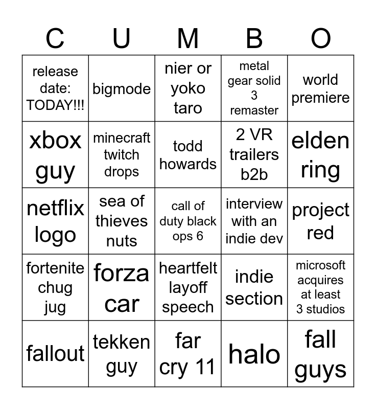 This bingo card has a free space and 24 words: forza car, tekken guy, todd howards, fallout, world premiere, release date: TODAY!!!, xbox guy, bigmode, interview with an indie dev, heartfelt layoff speech, 2 VR trailers b2b, netflix logo, indie section, microsoft acquires at least 3 studios, minecraft twitch drops, halo, project red, nier or yoko taro, elden ring, sea of thieves nuts, fall guys, fortenite chug jug, metal gear solid 3 remaster and far cry 11.