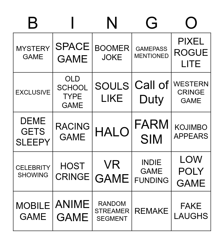 This bingo card has a free space and 24 words: HOST CRINGE, ANIME GAME, SOULS LIKE, MOBILE GAME, PIXEL ROGUE LITE, MYSTERY GAME, EXCLUSIVE, SPACE GAME, FARM SIM, VR GAME, Call of Duty, DEME GETS SLEEPY, INDIE GAME FUNDING, LOW POLY GAME, OLD SCHOOL TYPE GAME, REMAKE, KOJIMBO APPEARS, BOOMER JOKE, WESTERN CRINGE GAME, RACING GAME, FAKE LAUGHS, CELEBRITY SHOWING, GAMEPASS MENTIONED and RANDOM STREAMER SEGMENT.