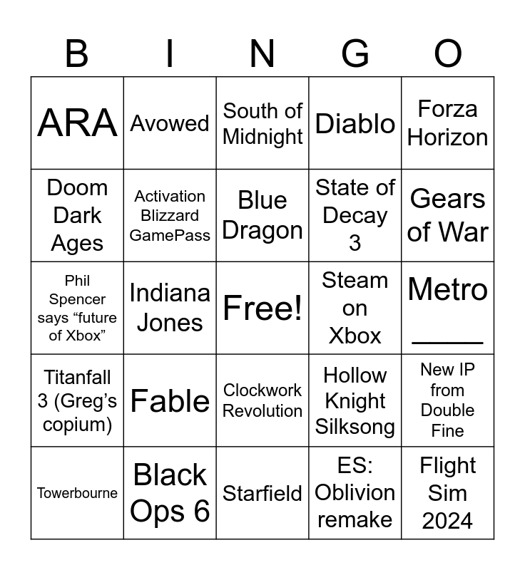 This bingo card has a free space and 24 words: Fable, Black Ops 6, Blue Dragon, Towerbourne, Forza Horizon, ARA, Doom Dark Ages, Avowed, Steam on Xbox, Clockwork Revolution, State of Decay 3, Phil Spencer says “future of Xbox”, Hollow Knight Silksong, New IP from Double Fine, Activation Blizzard GamePass, ES: Oblivion remake, Metro ____, South of Midnight, Gears of War, Indiana Jones, Flight Sim 2024, Titanfall 3 (Greg’s copium), Diablo and Starfield.