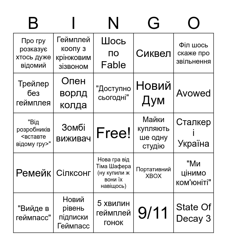 This bingo card has a free space and 24 words: Сілксонг, Новий рівень підписки Геймпасс, "Доступно сьогодні", "Вийде в геймпасс", Філ шось скаже про звільнення, Про гру розказує хтось дуже відомий, Трейлер без геймплея, Геймплей коопу з крінжовим зізвоном, Майки купляють ше одну студію, Нова гра від Тіма Шафера (ну купили ж вони їх навіщось), Новий Дум, "Від розробників <вставте відому гру>", Портативний XBOX, "Ми цінимо ком'юніті", Опен ворлд колда, 9/11, Сталкер і Україна, Шось по Fable, Avowed, Зомбі виживач, State Of Decay 3, Ремейк, Сиквел and 5 хвилин геймплей гонок.