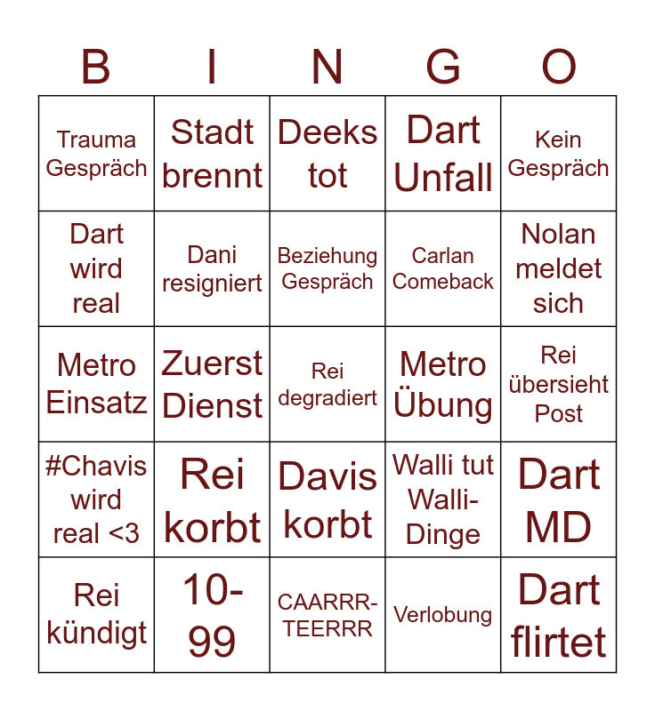 This bingo card has 25 words: Rei korbt, CAARRR- TEERRR, Beziehung Gespräch, Rei kündigt, Kein Gespräch, Trauma Gespräch, Dart wird real, Stadt brennt, Metro Übung, Davis korbt, Carlan Comeback, Metro Einsatz, Walli tut Walli-Dinge, Dart MD, Dani resigniert, Dart flirtet, Rei übersieht Post, Deeks tot, Nolan meldet sich, Zuerst Dienst, Rei degradiert, 10-99, #Chavis wird real <3, Dart Unfall and Verlobung.