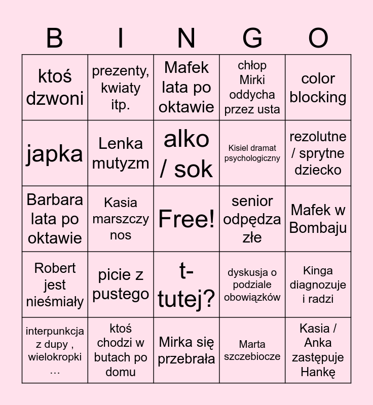 This bingo card has a free space and 24 words: picie z pustego, ktoś chodzi w butach po domu, alko / sok, interpunkcja z dupy , wielokropki …, color blocking, ktoś dzwoni, japka, prezenty, kwiaty itp., senior odpędza złe, t-tutej?, Kisiel dramat psychologiczny, Barbara lata po oktawie, dyskusja o podziale obowiązków, Kinga diagnozuje i radzi, Lenka mutyzm, Marta szczebiocze, Mafek w Bombaju, Mafek lata po oktawie, rezolutne / sprytne dziecko, Kasia marszczy nos, Kasia / Anka zastępuje Hankę, Robert jest nieśmiały, chłop Mirki oddycha przez usta and Mirka się przebrała.