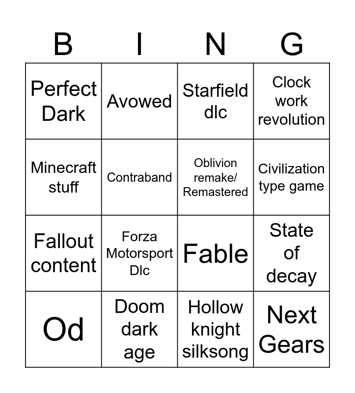 This bingo card has 16 words: Doom dark age, State of decay, Starfield dlc, Perfect Dark, Fallout content, Avowed, Fable, Hollow knight silksong, Minecraft stuff, Contraband, Od, Clock work revolution, Forza Motorsport Dlc, Civilization type game, Oblivion remake/ Remastered and Next Gears.