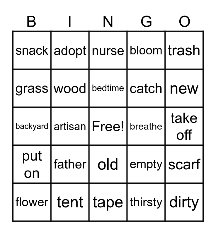 This bingo card has a free space and 24 words: father, tent, bedtime, flower, trash, snack, grass, adopt, breathe, old, catch, backyard, empty, scarf, wood, thirsty, take off, nurse, new, artisan, dirty, put on, bloom and tape.