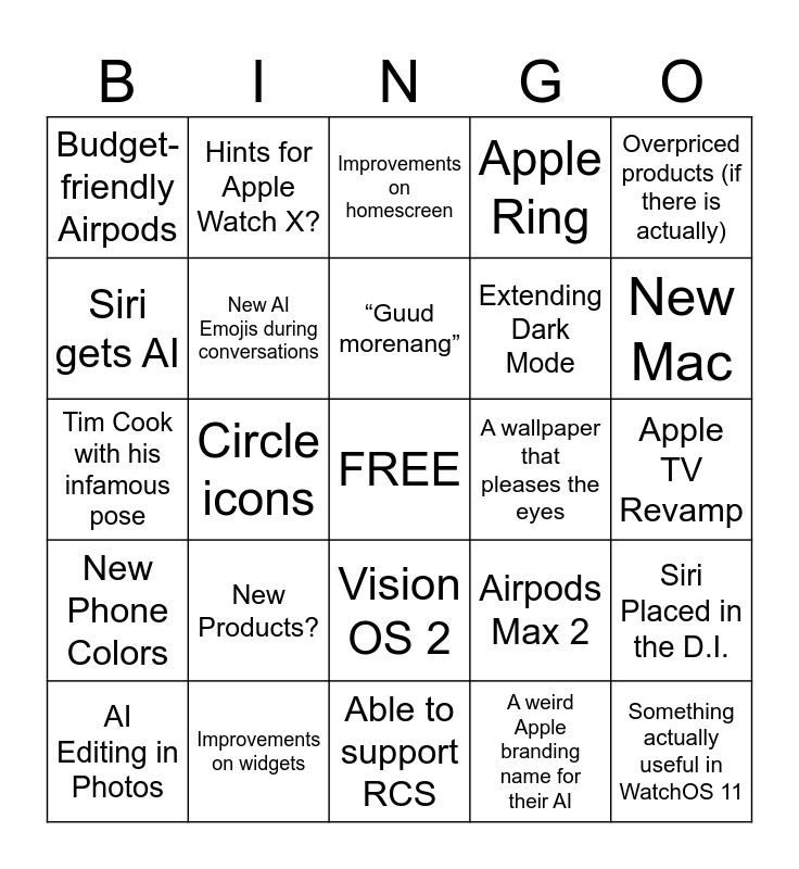 This bingo card has a free space and 24 words: New Products?, Improvements on widgets, “Guud morenang”, AI Editing in Photos, Overpriced products (if there is actually), Budget-friendly Airpods, Siri gets AI, Hints for Apple Watch X?, A wallpaper that pleases the eyes, Vision OS 2, Extending Dark Mode, Tim Cook with his infamous pose, Airpods Max 2, Siri Placed in the D.I., New AI Emojis during conversations, A weird Apple branding name for their AI, Apple TV Revamp, Improvements on homescreen, New Mac, Circle icons, Something actually useful in WatchOS 11, New Phone Colors, Apple Ring and Able to support RCS.