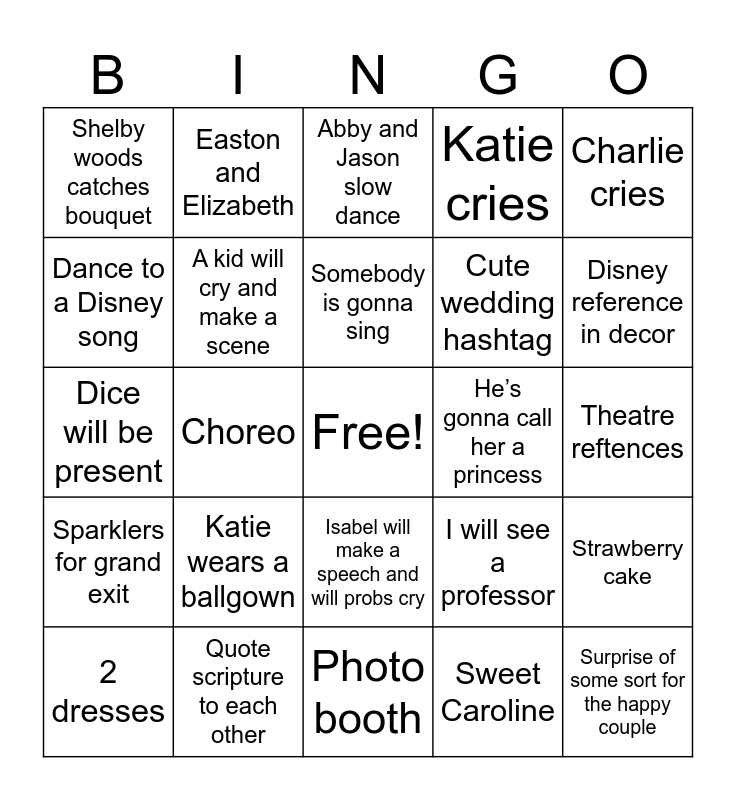 This bingo card has a free space and 24 words: Katie wears a ballgown, Quote scripture to each other, Somebody is gonna sing, 2 dresses, Charlie cries, Shelby woods catches bouquet, Dance to a Disney song, Easton and Elizabeth, He’s gonna call her a princess, Isabel will make a speech and will probs cry, Cute wedding hashtag, Dice will be present, I will see a professor, Strawberry cake, A kid will cry and make a scene, Sweet Caroline, Theatre reftences, Abby and Jason slow dance, Disney reference in decor, Choreo, Surprise of some sort for the happy couple, Sparklers for grand exit, Katie cries and Photo booth.