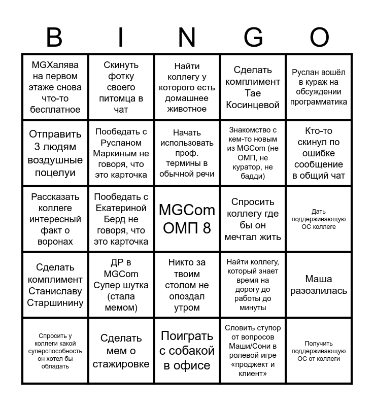 This bingo card has a free space and 24 words: ДР в MGCom Супер шутка (стала мемом), Сделать мем о стажировке, Начать использовать проф. термины в обычной речи, Спросить у коллеги какой суперспособность он хотел бы обладать, Руслан вошёл в кураж на обсуждении программатика, MGХалява на первом этаже снова что-то бесплатное, Отправить 3 людям воздушные поцелуи, Скинуть фотку своего питомца в чат, Спросить коллегу где бы он мечтал жить, Никто за твоим столом не опоздал утром, Знакомство с кем-то новым из MGCom (не ОМП, не куратор, не бадди), Рассказать коллеге интересный факт о воронах, Найти коллегу, который знает время на дорогу до работы до минуты, Маша разозлилась, Пообедать с Русланом Маркиным не говоря, что это карточка, Словить ступор от вопросов Маши/Сони в ролевой игре «проджект и клиент», Дать поддерживающую ОС коллеге, Найти коллегу у которого есть домашнее животное, Кто-то скинул по ошибке сообщение в общий чат, Пообедать с Екатериной Берд не говоря, что это карточка, Получить поддерживающую ОС от коллеги, Сделать комплимент Станиславу Старшинину, Сделать комплимент Тае Косинцевой and Поиграть с собакой в офисе.