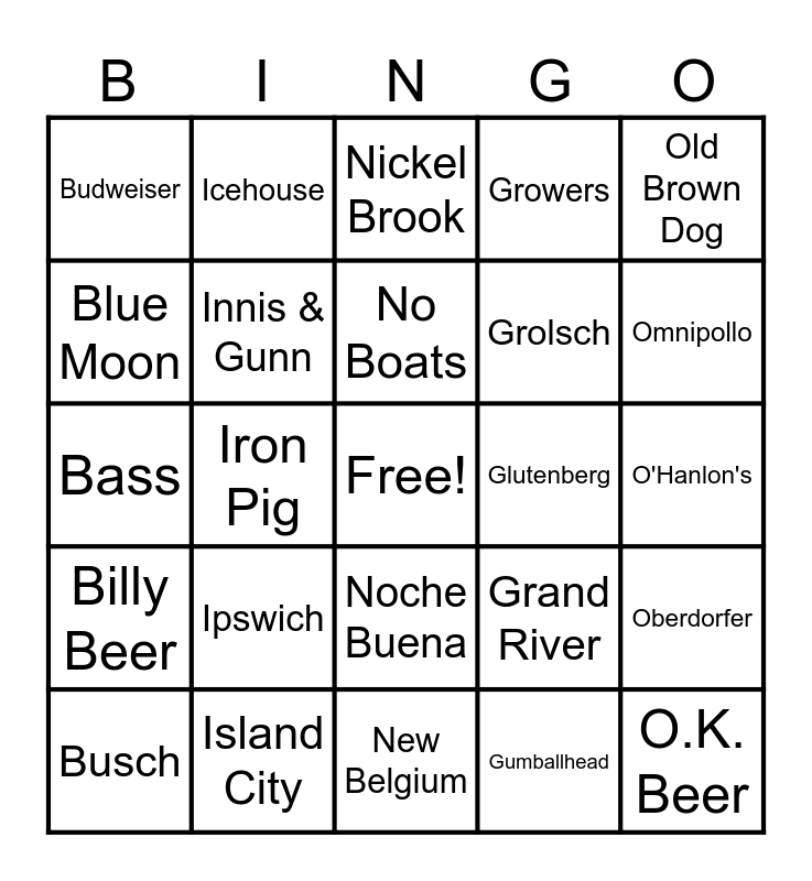 This bingo card has a free space and 39 words: Big Easy, Independence, Northumberland, Grand River, Oberdorfer, Billy Beer, Iron Pig, Niagara Cider, Glutenberg, O'Hanlon's, Blue Moon, Icehouse, Goose Island, Omnipollo, Bass, Ipswich, Noche Buena, Growers, Ottakringer, Busch, Innis & Gunn, No Boats, Gumballhead, Old Brown Dog, Becks, Island City, New Belgium, Guinness, Ommegang, Budweiser, Indie Ale House, No Nonsense, Grolsch, O.K. Beer, Big Sky, Imperial City, Nickel Brook, Great Divide and Overflow.