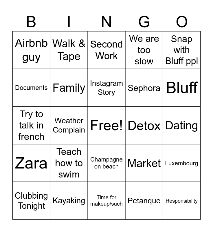 This bingo card has a free space and 24 words: Teach how to swim, Kayaking, Instagram Story, Clubbing Tonight, Snap with Bluff ppl, Airbnb guy, Documents, Walk & Tape, Detox, Champagne on beach, Sephora, Try to talk in french, Market, Luxembourg, Family, Petanque, Dating, Second Work, Bluff, Weather Complain, Responsibility, Zara, We are too slow and Time for makeup/such.