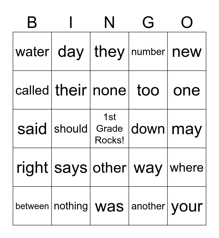 This bingo card has a free space and 26 words: other, another, none, nothing, new, water, called, day, may, way, too, said, where, between, should, month, number, right, they, your, one, was, down, says, their and word.