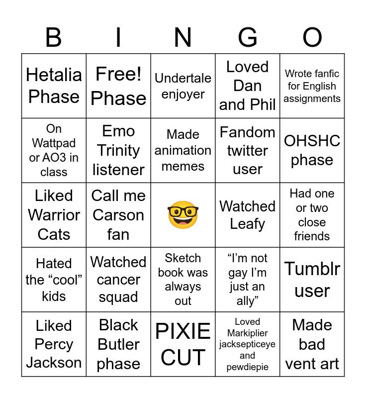 This bingo card has a free space and 24 words: Watched cancer squad, Black Butler phase, Made animation memes, Liked Percy Jackson, Wrote fanfic for English assignments, Hetalia Phase, On Wattpad or AO3 in class, Free! Phase, Watched Leafy, Sketch book was always out, Fandom twitter user, Liked Warrior Cats, “I’m not gay I’m just an ally”, Tumblr user, Emo Trinity listener, Loved Markiplier jacksepticeye and pewdiepie, Had one or two close friends, Undertale enjoyer, OHSHC phase, Call me Carson fan, Made bad vent art, Hated the “cool” kids, Loved Dan and Phil and PIXIE CUT.