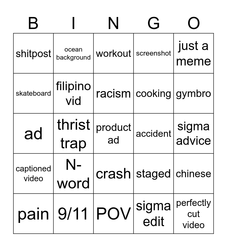 This bingo card has a free space and 24 words: N-word, 9/11, racism, pain, just a meme, shitpost, skateboard, ocean background, accident, crash, cooking, ad, staged, chinese, filipino vid, sigma edit, sigma advice, workout, gymbro, thrist trap, perfectly cut video, captioned video, screenshot and POV.