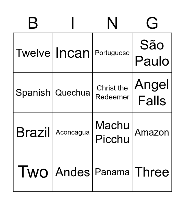 This bingo card has 16 words: Andes, Amazon, Portuguese, Twelve, Brazil, Incan, Machu Picchu, Panama, Spanish, Quechua, Two, São Paulo, Aconcagua, Angel Falls, Christ the Redeemer and Three.
