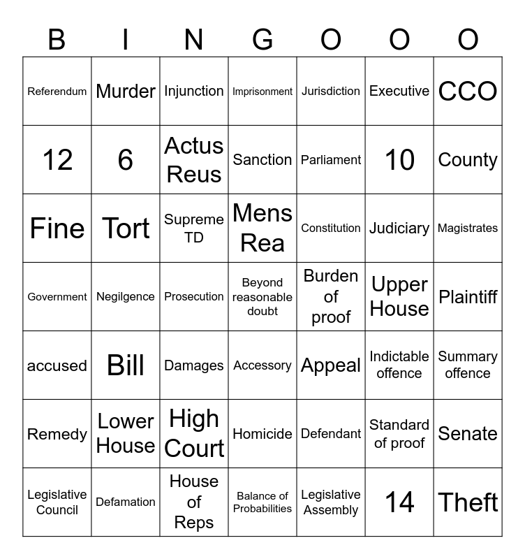 This bingo card has a free space and 48 words: Defendant, 10, Balance of Probabilities, Negilgence, Supreme TD, Plaintiff, Murder, Defamation, Executive, Accessory, CCO, Imprisonment, Judiciary, Constitution, Remedy, Upper House, 12, County, Standard of proof, Jurisdiction, Parliament, Prosecution, Referendum, 6, Senate, Actus Reus, Magistrates, Legislative Council, Mens Rea, Tort, 14, Burden of proof, Summary offence, Lower House, Government, Appeal, Indictable offence, Fine, Damages, High Court, accused, Theft, Injunction, House of Reps, Sanction, Homicide, Bill and Legislative Assembly.