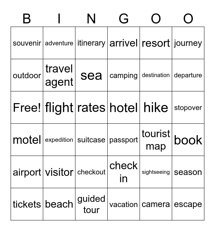 This bingo card has 36 words: check in, checkout, vacation, outdoor, motel, hotel, travel agent, guided tour, resort, sightseeing, departure, arrivel, season, flight, camping, souvenir, airport, hike, Free!, itinerary, rates, expedition, passport, suitcase, tourist map, adventure, destination, beach, sea, journey, escape, tickets, book, stopover, visitor and camera.