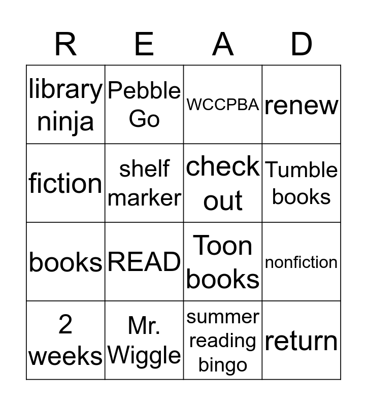 This bingo card has 16 words: Mr. Wiggle, nonfiction, WCCPBA, library ninja, books, Pebble Go, Toon books, summer reading bingo, fiction, shelf marker, 2 weeks, renew, READ, Tumble books, check out and return.