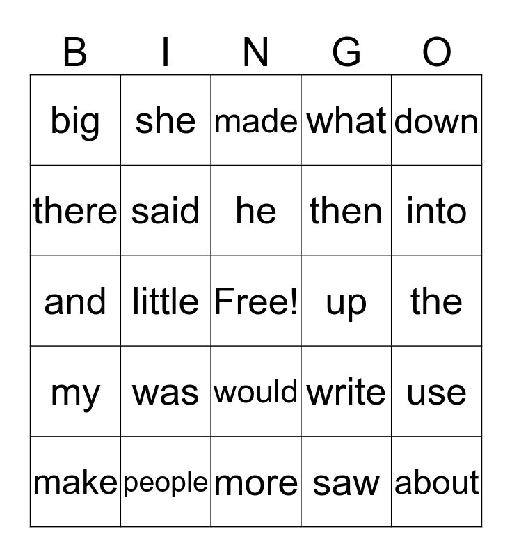 This bingo card has a free space and 24 words: was, people, he, make, down, big, there, she, up, would, then, and, write, use, said, saw, the, made, into, little, about, my, what and more.