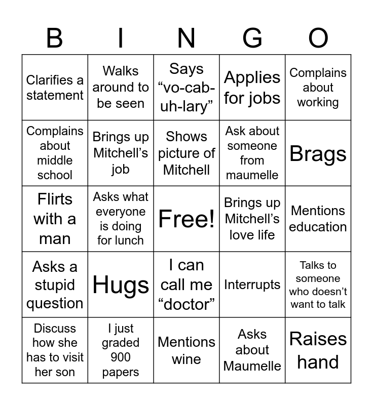 This bingo card has a free space and 24 words: Hugs, I just graded 900 papers, Shows picture of Mitchell, Discuss how she has to visit her son, Complains about working, Clarifies a statement, Complains about middle school, Walks around to be seen, Brings up Mitchell’s love life, I can call me “doctor”, Ask about someone from maumelle, Flirts with a man, Interrupts, Talks to someone who doesn’t want to talk, Brings up Mitchell’s job, Asks about Maumelle, Mentions education, Says “vo-cab-uh-lary”, Brags, Asks what everyone is doing for lunch, Raises hand, Asks a stupid question, Applies for jobs and Mentions wine.