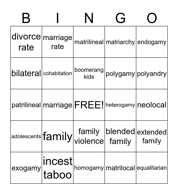 This bingo card has a free space and 24 words: family, incest taboo, boomerang kids, exogamy, endogamy, divorce rate, bilateral, marriage rate, heterogamy, family violence, polygamy, patrilineal, blended family, extended family, cohabitation, matrilocal, neolocal, matrilineal, polyandry, marriage, equalitarian, adolescents, matriarchy and homogamy.