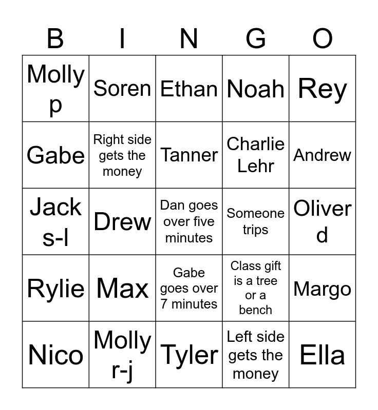This bingo card has a free space and 24 words: Max, Molly r-j, Tanner, Nico, Rey, Molly p, Gabe, Soren, Someone trips, Gabe goes over 7 minutes, Charlie Lehr, Jack s-l, Class gift is a tree or a bench, Margo, Right side gets the money, Left side gets the money, Oliver d, Ethan, Andrew, Drew, Ella, Rylie, Noah and Tyler.