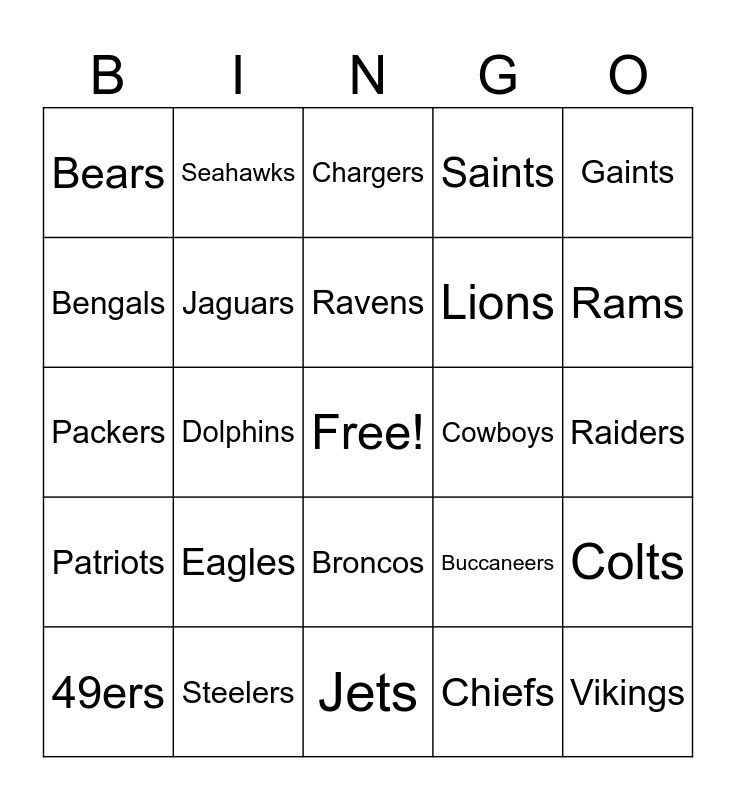 This bingo card has a free space and 24 words: Eagles, Steelers, Ravens, 49ers, Gaints, Bears, Bengals, Seahawks, Cowboys, Broncos, Lions, Packers, Buccaneers, Colts, Jaguars, Chiefs, Raiders, Chargers, Rams, Dolphins, Vikings, Patriots, Saints and Jets.