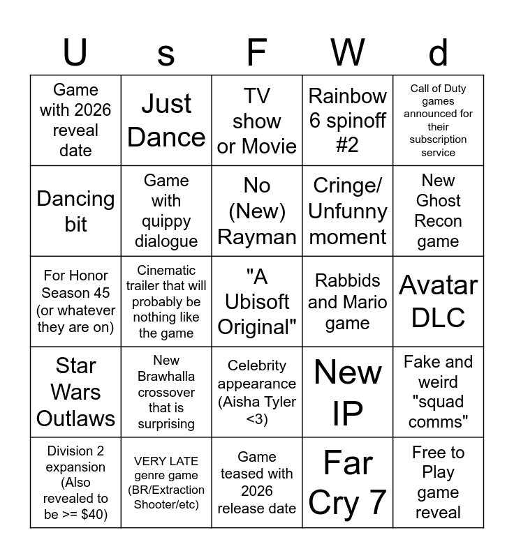 This bingo card has a free space and 34 words: New Assassin's Creed teaser (not Shadows), Far Cry 7, Announcing of another random major IP game, Mobile game, Star Wars Outlaws, Game with quippy dialogue, Call of Duty games announced for their subscription service, Division 2 expansion (Also revealed to be >= $40), Just Dance, Game costs $70, when it shouldn't, No (New) Rayman, TV show or Movie, XDefiant Seaon 1 (and brag about how many players they have had + streamer highlights, will include at least 1 clip of someone getting a lot of kills with the 1 shot pistol ult with wallhacks), Beyond Good and Evil 2, Rabbids and Mario game, New Ghost Recon game, VERY LATE genre game (BR/Extraction Shooter/etc), For Honor Season 45 (or whatever they are on), New Brawhalla crossover that is surprising, New IP, Celebrity appearance (Aisha Tyler <3), The Crew, Game with 2026 reveal date, Avatar DLC, Game teased with 2026 release date, Free to Play game reveal, Rainbow 6 spinoff #2, Horror Game, Cringe/ Unfunny moment, Dancing bit, Yves shows up, Cinematic trailer that will probably be nothing like the game, Fake and weird "squad comms" and Survival game.
