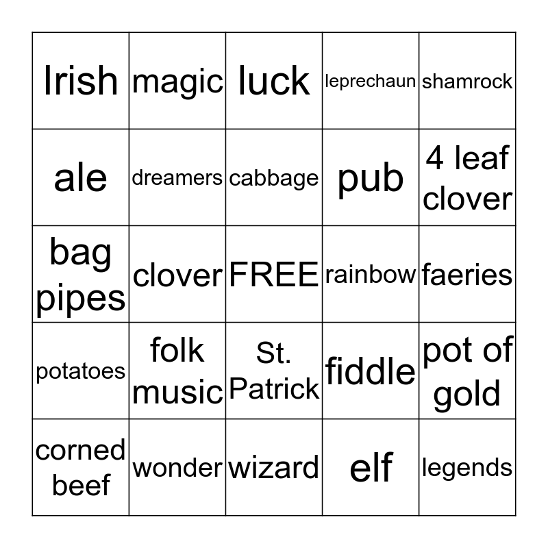 This bingo card has a free space and 24 words: folk music, wonder, cabbage, corned beef, shamrock, Irish, ale, magic, rainbow, St. Patrick, pub, bag pipes, fiddle, pot of gold, dreamers, elf, faeries, luck, 4 leaf clover, clover, legends, potatoes, leprechaun and wizard.