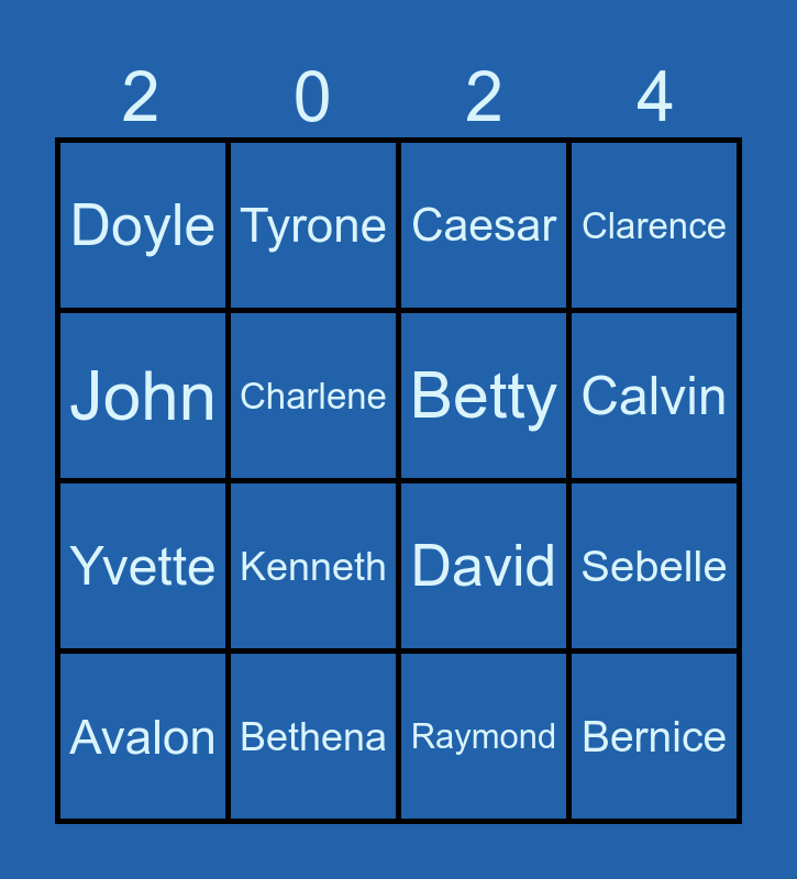 This bingo card has 20 words: Sebelle, Larry, Caesar, Willie, Avalon, John, Bethena, Doyle, Yvette, Tyrone, Kenneth, David, Charlene, Bernice, Betty, Lorraine, Calvin, Clarence, Raymond and Maebelle.