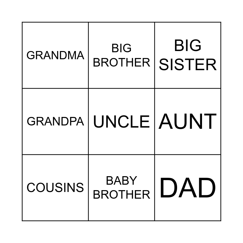 This bingo card has 12 words: MOM, DAD, UNCLE, AUNT, BIG BROTHER, BIG SISTER, BABY BROTHER, BABY SISTER, GRANDMA, GRANDPA, COUSINS and FRIENDS.