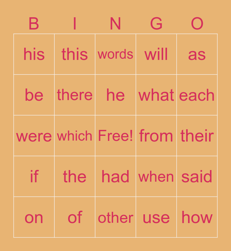 This bingo card has a free space and 24 words: the, of, he, on, as, his, be, this, from, had, what, were, when, said, there, use, their, words, each, which, how, if, will and other.