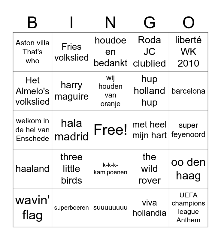 This bingo card has a free space and 42 words: You'll never walk alone, wij houden van oranje, ik spring voor nac, three little birds, viva hollandia, oo den haag, UEFA champions league Anthem, we are the champions, houdoe en bedankt, k-k-k-kamipoenen, super feyenoord, barcelona, hala madrid, liberté WK 2010, jij krijgt die lach niet van mijn gezicht, the wild rover, breda ik hou van jou, welkom in de hel van Enschede, AZ lied, Fries volkslied, Het Almelo's volkslied, Dortmund unsere stadt, mijn club, Aston villa That's who, Ons eagles deventer, laerger than life, hup holland hup, hand in hand, virgil van dijk, live is life, sweet caroline, haaland, harry maguire, suuuuuuuu, waka waka, wavin' flag, superboeren, met heel mijn hart, clublied FC volendam, Het FC utrecht strijdlied, Roda JC clublied and het is stil aan de overkant.
