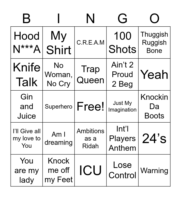 This bingo card has a free space and 24 words: You are my lady, Am I dreaming, Trap Queen, Lose Control, Thuggish Ruggish Bone, Hood N***A, My Shirt, C.R.E.A.M, Just My Imagination, Knockin Da Boots, Gin and Juice, No Woman, No Cry, Int’l Players Anthem, 24’s, Knife Talk, Knock me off my Feet, ICU, 100 Shots, Yeah, I’ll Give all my love to You, Superhero, Ambitions as a Ridah, Ain’t 2 Proud 2 Beg and Warning.
