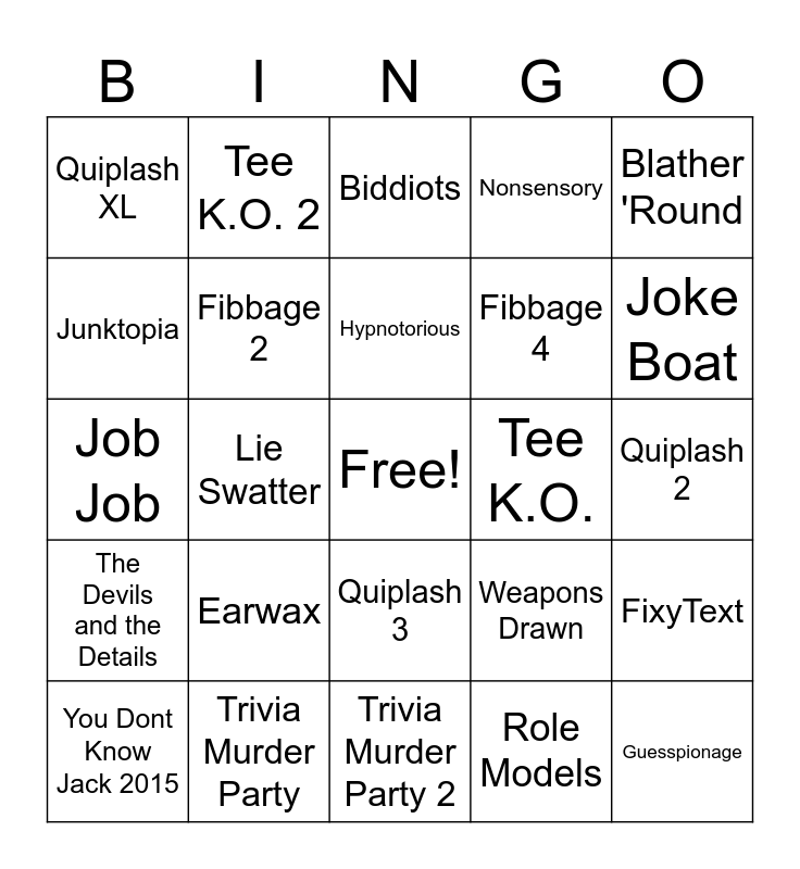 This bingo card has a free space and 29 words: You Dont Know Jack 2015, Fibbage XL, Lie Swatter, Drawful, Quiplash XL, Biddiots, Fibbage 2, Earwax, Tee K.O., Trivia Murder Party, Quiplash 2, Guesspionage, Trivia Murder Party 2, Role Models, Joke Boat, Dictionarium, Quiplash 3, The Devils and the Details, Blather 'Round, Job Job, Weapons Drawn, The Wheel of Enormous Proportions, Fibbage 4, Junktopia, Nonsensory, Tee K.O. 2, FixyText, Hypnotorious and Time Hop.