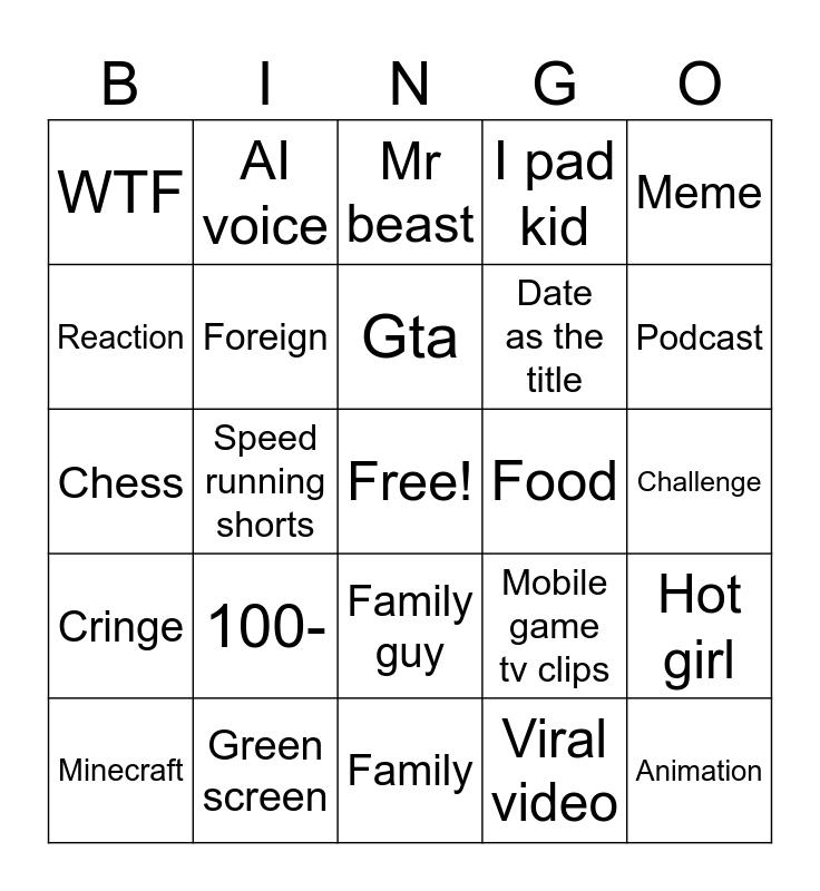 This bingo card has a free space and 24 words: 100-, Green screen, Gta, Minecraft, Meme, WTF, Reaction, AI voice, Food, Family guy, Date as the title, Chess, Mobile game tv clips, Hot girl, Foreign, Viral video, Challenge, Mr beast, Podcast, Speed running shorts, Animation, Cringe, I pad kid and Family.