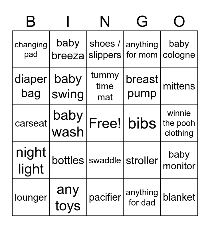 This bingo card has a free space and 25 words: bottles, pacifier, tummy time mat, lounger, baby cologne, changing pad, diaper bag, baby breeza, bibs, swaddle, breast pump, carseat, stroller, baby monitor, baby swing, spiderman clothing, winnie the pooh clothing, shoes / slippers, mittens, baby wash, blanket, any toys, night light, anything for mom and anything for dad.