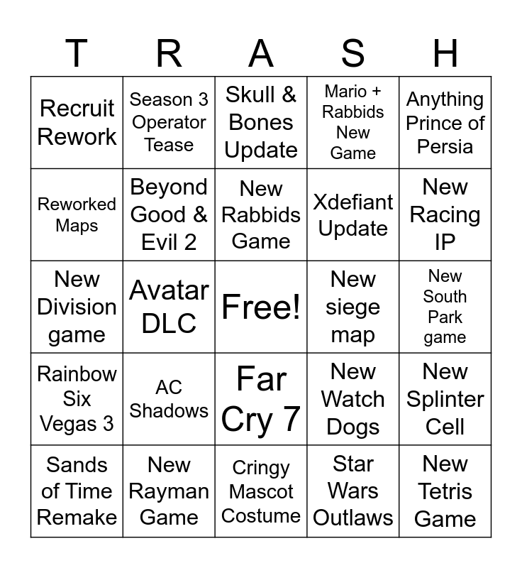 This bingo card has a free space and 24 words: AC Shadows, New Rayman Game, New Rabbids Game, Sands of Time Remake, Anything Prince of Persia, Recruit Rework, Reworked Maps, Season 3 Operator Tease, New siege map, Far Cry 7, Xdefiant Update, New Division game, New Watch Dogs, New Splinter Cell, Beyond Good & Evil 2, Star Wars Outlaws, New South Park game, Skull & Bones Update, New Racing IP, Avatar DLC, New Tetris Game, Rainbow Six Vegas 3, Mario + Rabbids New Game and Cringy Mascot Costume.