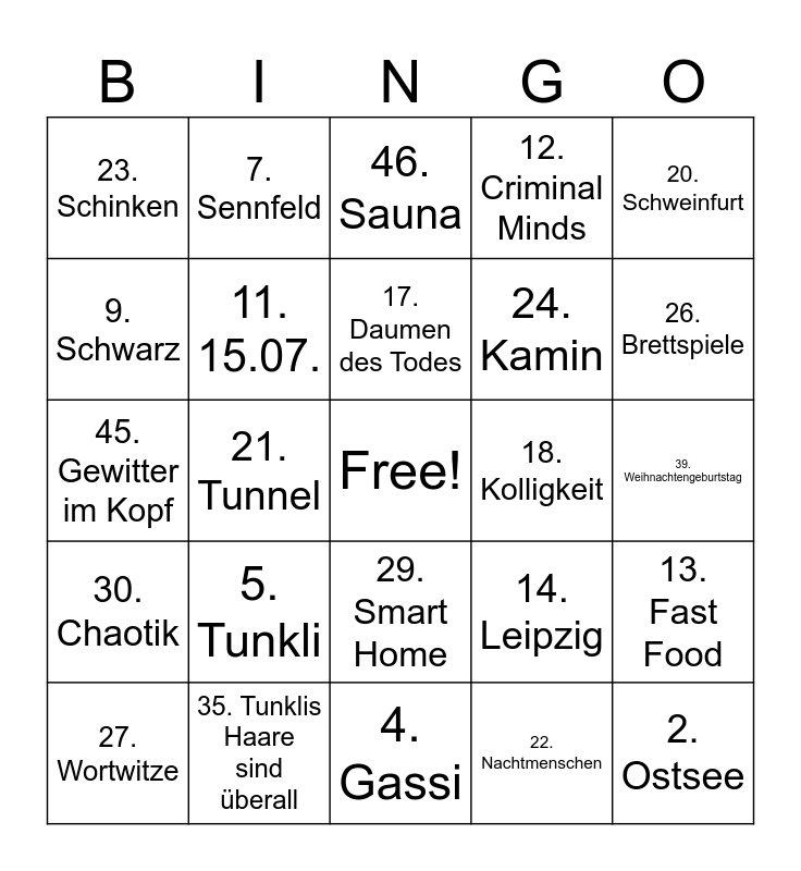 This bingo card has a free space and 49 words: 1. Don't Starve, 2. Ostsee, 3. Bödö, 4. Gassi, 5. Tunkli, 6. Haus, 7. Sennfeld, 8. Coutch-Haia, 9. Schwarz, 10. Zocken, 11. 15.07., 12. Criminal Minds, 13. Fast Food, 14. Leipzig, 15. Metal, 16. Eigene Sprache, 17. Daumen des Todes, 18. Kolligkeit, 19. Verbeulter Dacia, 20. Schweinfurt, 21. Tunnel, 22. Nachtmenschen, 23. Schinken, 24. Kamin, 25. Garrys Mod, 26. Brettspiele, 27. Wortwitze, 28. Unsinn, 29. Smart Home, 30. Chaotik, 31. Kreativ, 32. Uffz, 33. bell, 34. Post-Apokalyptik, 35. Tunklis Haare sind überall, 36. Stiefel, 37. Grillen, 38. Betongarten, 39. Weihnachtengeburtstag, 40. Eigenständigkeit, 41. Met, 42. Tierlieb, 43. Jobs die und Spaß machen, 44. Brettspiele, 45. Gewitter im Kopf, 46. Sauna, 47. Eis, 48. Zuckerwatte and 49..
