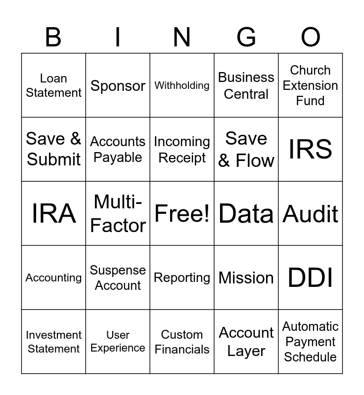 This bingo card has a free space and 44 words: User Group, Automatic Payment Schedule, Payment Schedule Record, Investment Statement, Historical Data, Account Layer, Withholding, Loan Fund, Church Extension Fund, User Experience, Business Central, Data, Reporting, Suspense Account, Subledger Balancing, Custom Financials, Job Processing, IRA, Custodians, IRS, Sponsor, Dynamics, New Portal, Loan Statement, Enhancements, Audit, Constituent, PowerBI, Mission, Accounting, Confluence, DDI, DDI-Connect, Interest Payment Allocation, Multi-Factor, Investment, Loan, Foundation, Incoming Receipt, Save & Submit, Save & Flow, DILA, Accounts Payable and Post & Print.