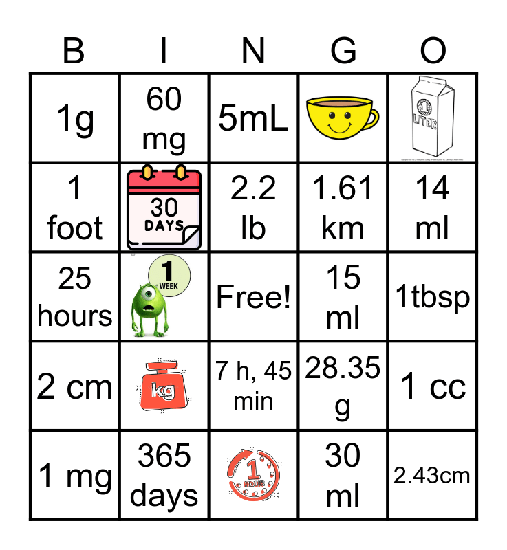 This bingo card has 6 images, a free space and 18 words: 1 mg, 2.2 lb, 30 ml, 1g, 60 mg, 5mL, 15 ml, 1tbsp, 25 hours, 28.35 g, 1 cc, 1 foot, 365 days, 14 ml, 2 cm, 7 h, 45 min, 1.61 km and 2.43cm.