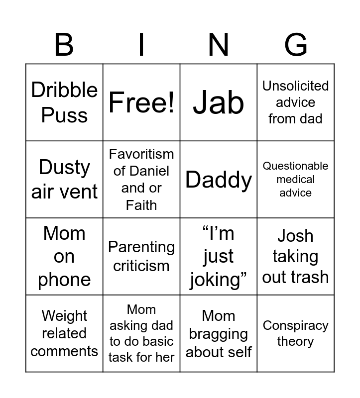 This bingo card has 19 words: “I’m just joking”, We don’t realize how good Will is, Jab, Conspiracy theory, Josh taking out trash, Dusty air vent, Mom bragging about self, Dribble Puss, Free!, Mom on phone, Parenting criticism, Favoritism of Daniel and or Faith, Daddy, Mom asking dad to do basic task for her, Weight related comments, Fearmongering, Unsolicited advice from dad, Questionable medical advice and Paci comment.