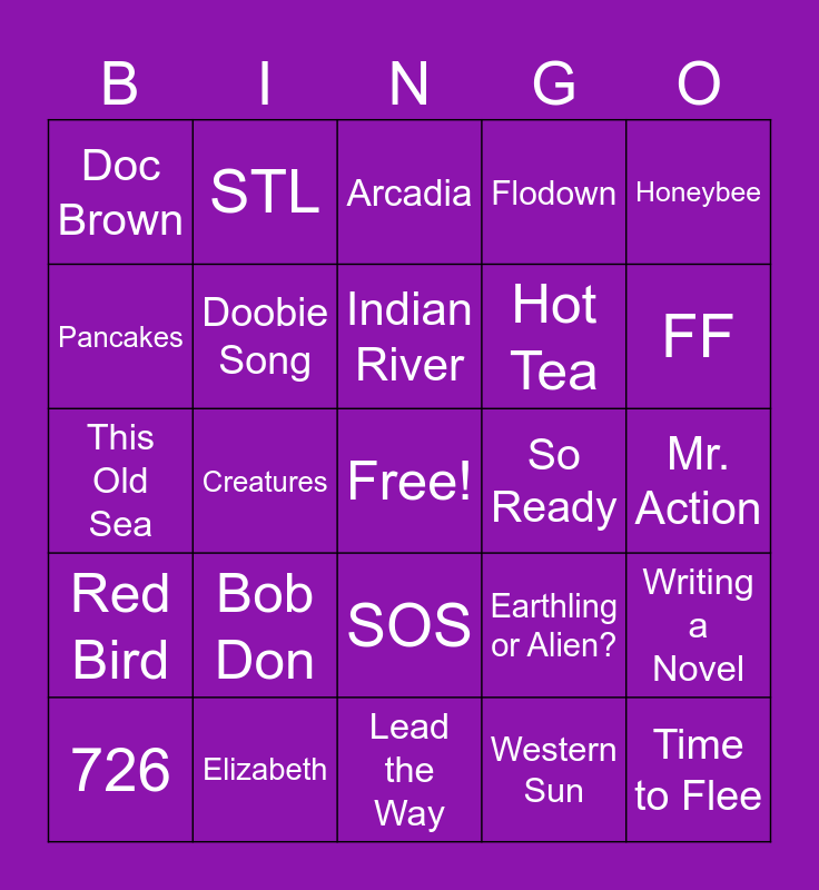 This bingo card has a free space and 24 words: Bob Don, Elizabeth, Indian River, 726, Honeybee, Doc Brown, Pancakes, STL, So Ready, SOS, Hot Tea, This Old Sea, Earthling or Alien?, Writing a Novel, Doobie Song, Western Sun, Mr. Action, Arcadia, FF, Creatures, Time to Flee, Red Bird, Flodown and Lead the Way.